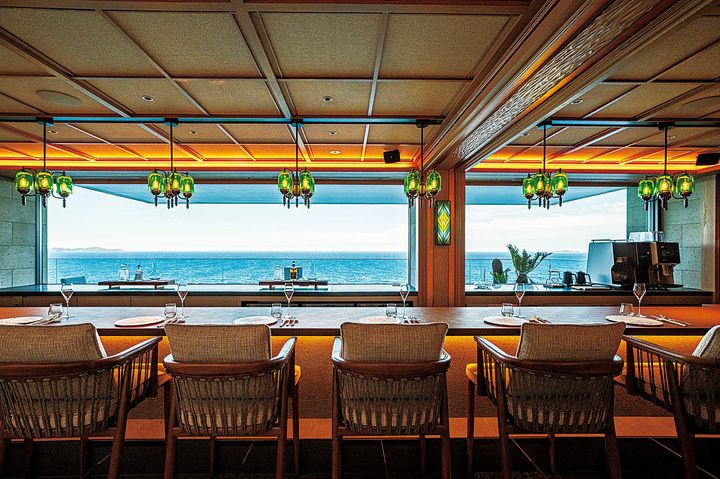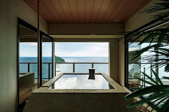 相模灘を見下ろす老舗旅館が、洗練されたラグジュアリー宿へ再編集。前身となる旅館の造作も残しながら、モダンなセンスで改築された空間は、親しみやすい懐かしさと新鮮さが調和するネオレトロなムード。16室の客室は全て源泉かけ流しの露天風呂を備え、東伊豆の海と広い空を一望できます。広々としたシンプルモダンなタイプをはじめ、プライベートサウナやカラオケルームを備えた特別室など、さまざまな旅の形に寄り添うバリエーションも魅力。館内のレストラン「汐と杯」では、地元で獲れた新鮮な海の幸をふんだんに使い、郷土料理を礎に工夫を凝らした美食を提供。唯一無二のおもてなしに五感が満たされます。