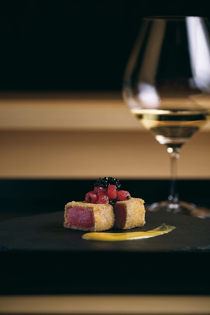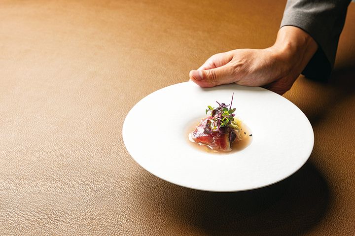 「懐石料理 花壇」のシグネチャー「マグロのカツレツ」は、レアな火入れが絶妙。