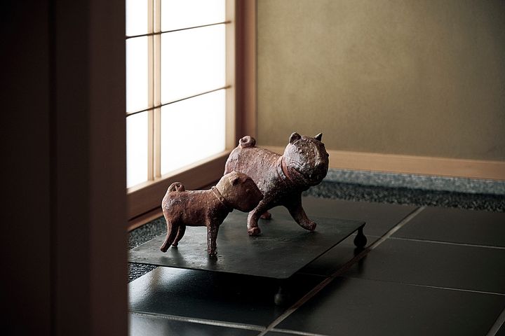 古美術から現代アートまで、いたるところに配したアート作品にも注目を。館内を散歩しているような親子の犬は渡辺愛子作の信楽焼。
