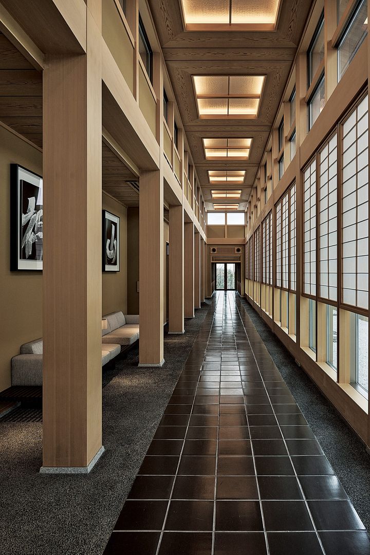 ロビーとエレベーターホールを結ぶ柱廊は、箱根「強羅花壇」を彷彿させるデザイン。その端には富士見台が。