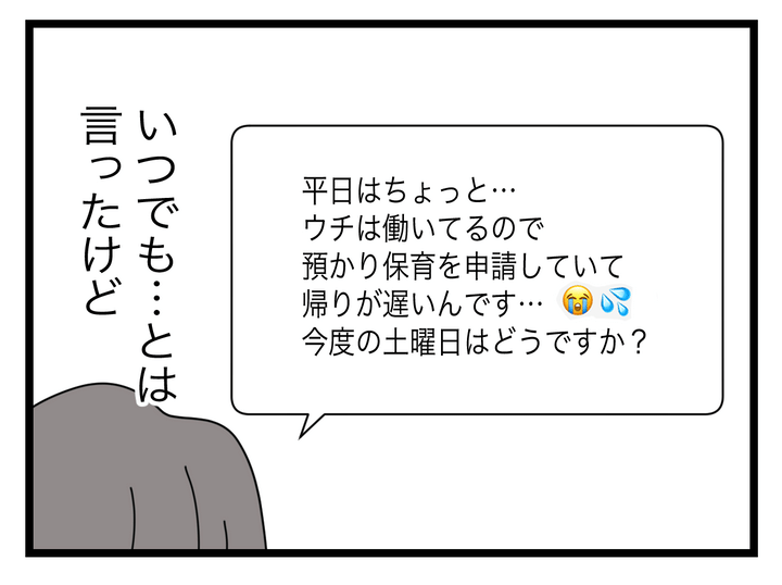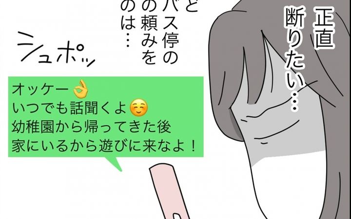 数日前、黒木さんは白田さんから“係のことで相談がある”と呼び止められます。正直、関わりたくない…でもバス停の付き合いは避けられない。曖昧に優しく返したつもりが、相手には都合よく受け取られることもあるのがママ友の難しさ。黒木さんの胸には「それなら、あんなこと言い出さなきゃよかったのに…」というモヤモヤが残っていきます。