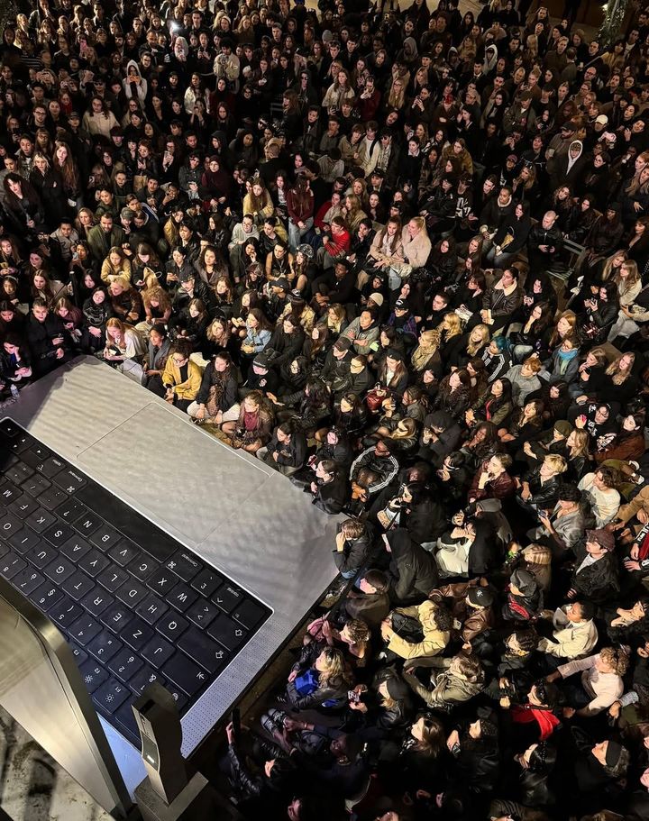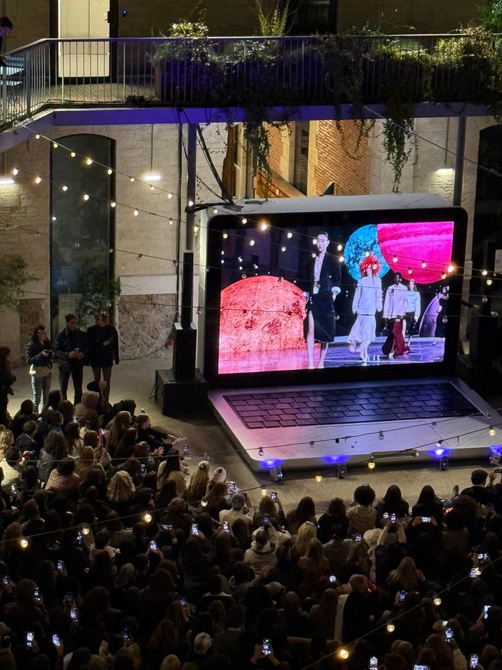 オープンエアスペースの中央には、MacBook風の巨大プロジェクターが設置され、観客は皆、とびきりおしゃれした姿で、無料のワインを片手に上映を待ち構えていました。
