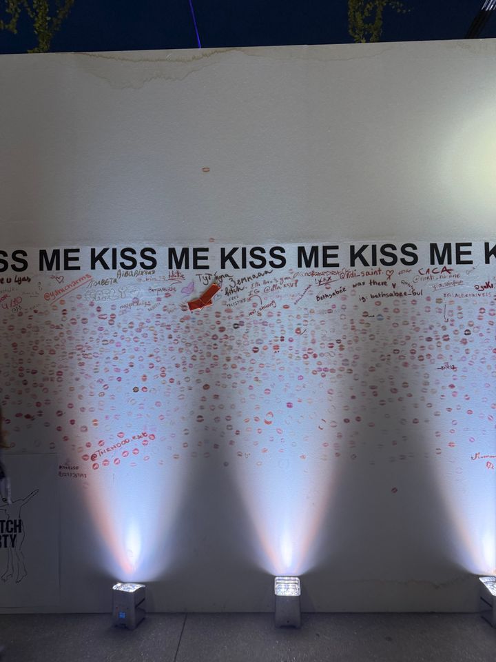 私が参加したのは、パリコレ最終日に行われたシャネルのウォッチパーティー。19:00ごろに到着し、上映開始まで1時間もあったにもかかわらず、会場をぐるりと回るほど長蛇の列が。VIPパスで無事に入ると、メイクブランドのM.A.Cによる「キスボード」がお出迎え。パーティ参加者は出席の“証”として、ここにチューして会場入りします。