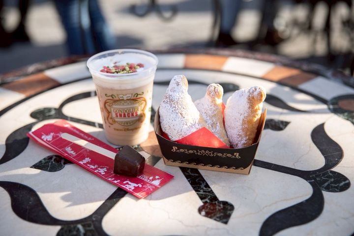 また、物語に出てくるスイーツを「ゴンドリエ・スナック」で実際に味わうこともできちゃうんです! 主人公ルロのアイデアでおいしさがアップした「キアッケレ(コーヒー&マスカルポーネ)」680円は、ゴンドラをかたどったお皿で提供されます。寒い日にぴったりな「ピスタチオとストロベリーのカフェモカ」850円と一緒に味わってみて。