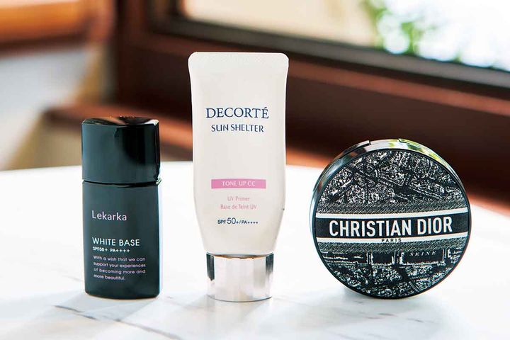 DIORクッションでツヤ肌に。エレガンスのチークPK101をふんわりのせ、DIORリップ094でプルプル唇に(古川さん)。レカルカの美白UV下地に、MiMCのクリームチーク11とポール&ジョーのパウダーチーク02を重ねジュワッと感を。DIORリップ256でツヤを(高麗さん)。コスデコの下地でトーンアップさせ、DIORチーク05で血色感をプラス。淡いピンクのDIORリップ001でハッピーフェイスに(松野さん)。