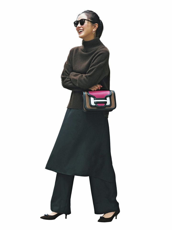 ニット¥49,500(LE PHIL/LE PHIL NEWoMan 新宿店)チュニック¥28,600(ガリャルダガランテ/ガリャルダガランテ 青山店)パンツ¥44,000(エストネーション)バッグ¥51,700(ヴァジック/ヴァジックジャパン)ローファー¥48,400(カステラーノ/フラッパーズ)ピアス¥28,600〈Raza〉リング[右手]¥19,800〈CAKI〉(ともにロードス)チョーカー¥41,140〈エムシー・スタジオ〉リング[左手]¥18,920〈バルブス〉(ともにズットホリック)