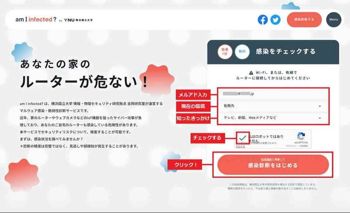 Wi-Fiルーターがマルウェアに感染しても、ユーザーが気づくことはほとんどありません。そこで役立つのが、横浜国立大学の情報・物理セキュリティ研究拠点吉岡研究室が運営する「am I infected?」という無料診断サービスです。