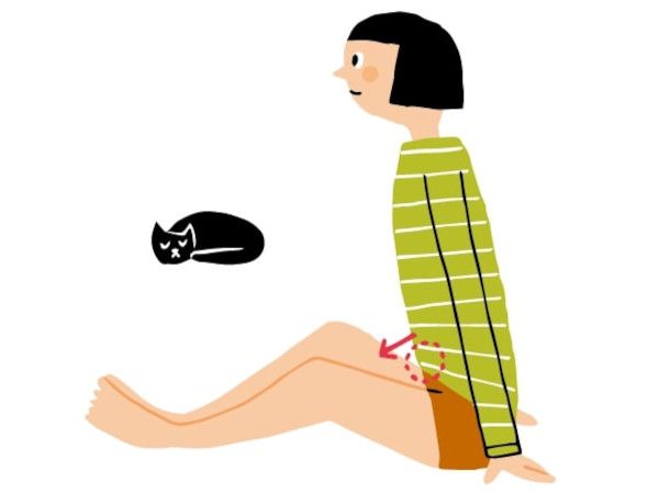 骨盤を立てたまま、おへそをグーッと前に押し出すように上半身を前傾させる。脚の付け根に力を入れて10秒間キープ。これを3~5回繰り返す。