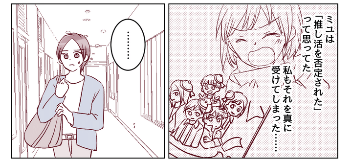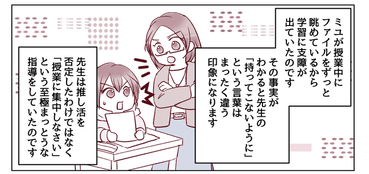 ミユの推しへの気持ちを否定しないよう、私は言葉を選びながら伝えました。「推しの方からしても、自分のせいでミユが注意されるなんてイヤなはずだよ? ミユが胸を張って、頑張っているよって言えた方がいいよね」