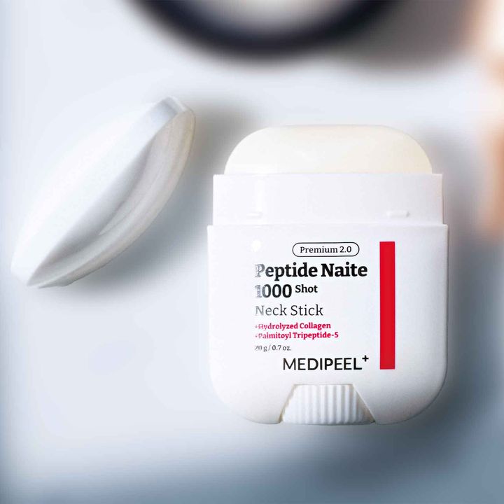 ペプチドスピキュール1,000ppm含有で縦横のシワにアプローチ。下から上になじませて使うネックケアスティック。MEDIPEEL プレミアムペプチドナイテ1000ショットネックスティック 20g¥2,310/セキド