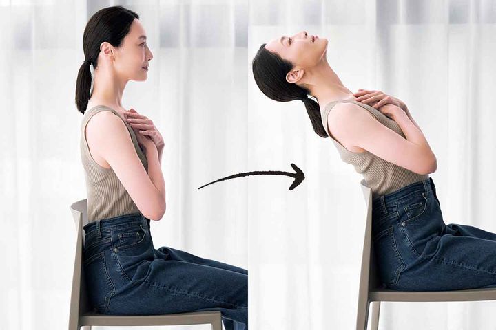 胸や首の前の筋肉を気持ちよく伸ばすエクササイズを習慣に。直角に座って手は胸に。頭を上に引き上げるようセット。胸を広げて首を後ろに折らずに斜め上に伸ばすように反らし、胸・デコルテ・首の前を伸ばします。