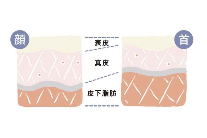 実は顔と首の皮膚の構造は違います。首は真皮が薄く半分程度。真皮はハリと弾力に関わるコラーゲンやエラスチン、ヒアルロン酸などから構成され、ここが薄いことで首は弾力が低下しやすいです。さらに真皮はターンオーバーが遅くケアの効果が出るのが年単位という特徴もあり。つまり効果が出るのが顔より遅れるので、普段からのケアがとても大切になります。