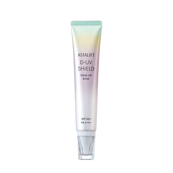 首も明るい印象にしたいのでトーンアップ下地を首にも。動きの激しい首にのせてもヨレずに密着してくれるものをチョイス。ディープ紫外線カットでたるみやシワを予防。アスタリフト D-UVシールド トーンアップ ローズ 30g ¥4,290/