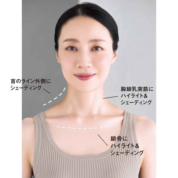 教えてくれたのはヘアメイクの陶山恵実さん。首のサイドにパウダーで影をプラス。胸鎖乳突筋と鎖骨に明るめコンシーラーをのせハイライトをオン。さらにシェーディングを入れてメリハリをプラス。