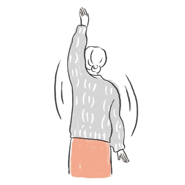 首が短く見える原因の一つは、もっこりした首と肩の境目の筋肉の張り。これを解消するには背泳ぎをするように大きく後ろ方向に肩を回す動きを取り入れてみて。ゆっくり10回ほど回すのが◎。