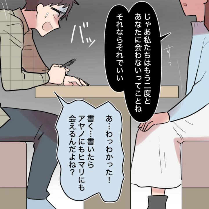 離婚届にいつまでも記入しないトモヤに「じゃあ私たちはもう二度とあなたに会わないってことね。それならそれでいい。」そう言い捨てて去ろうとすると、トモヤは慌てて「わ、わかった!書いたらアヤノにもヒマリにも会えるんだよね?」と、ようやく離婚届にサインしました。