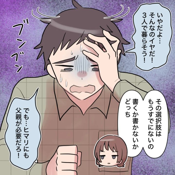 私に離婚を突きつけられて頭を抱えたトモヤはうろたえて離婚を拒否しました。「いやだよ。そんなのイヤだ!3人で暮らそう!」そんな言葉をかけられても、私には何の感情もわきませんでした。トモヤに私たちと暮らすという選択肢などもう既にありません。離婚届に記入するかしないか。それだけだと伝えると、トモヤは今更「でも、ヒマリにも父親が必要だろ!」と主張しました。妊娠中から出産を経て、これまでずっと、キョウカさんとキョウカさんとの間に作った子どもたちを優先して、ヒマリに関わったことなんてないくせに。
