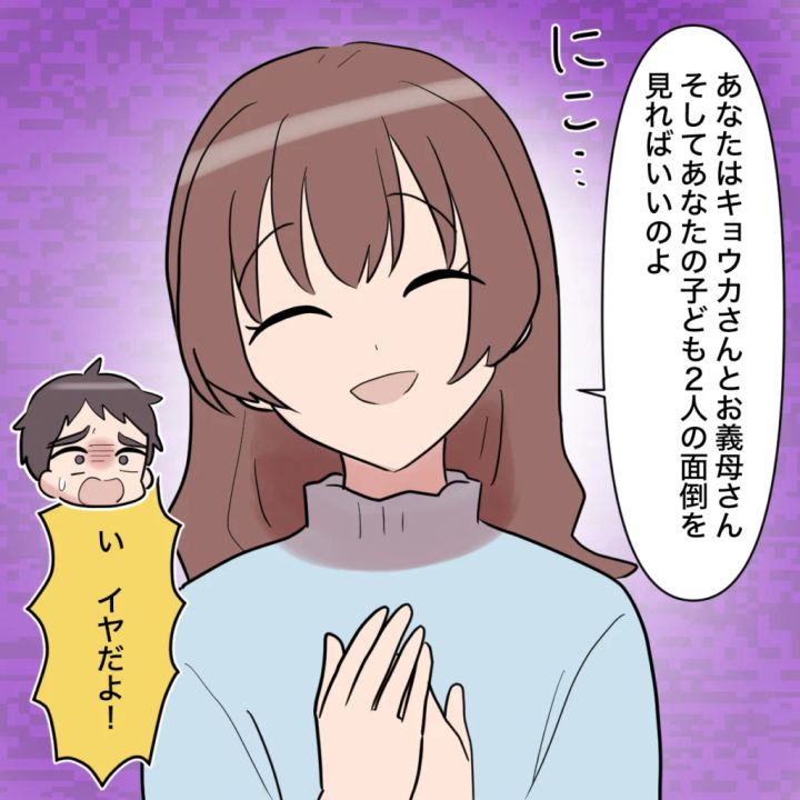 この期に及んで家族だの父親だのと言ってくるトモヤに、やっぱり何の感情もわきません。私は「あなたはキョウカさんとお義母さん、そしてあなたの子ども2人の面倒をみればいいのよ」とにっこり微笑んで言いました。今までもそうだったように、これからもそうして生きていけばいい。トモヤは「イヤだよ!」とまだ抵抗していました。