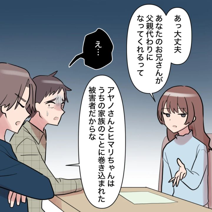私は無表情を崩さないまま、ナオキさんがヒマリの父親代わりになってくれるから全く問題ないとトモヤに伝えました。ナオキさんも、「アヤノさんとヒマリちゃんは、うちの家族のことに巻き込まれた被害者だから」と当然のようにうなずいてくれました。