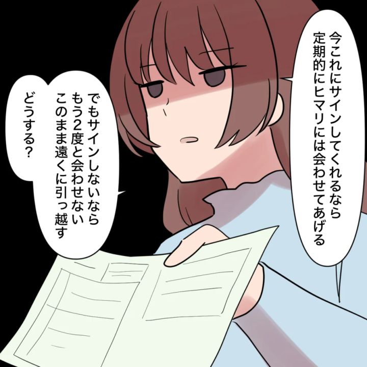 すぐに離婚届にサインするのなら定期的にヒマリには会わせてあげるけれど、サインを拒むならヒマリと2人で遠くに引っ越し、二度とトモヤに会わせるつもりはないことを告げました。