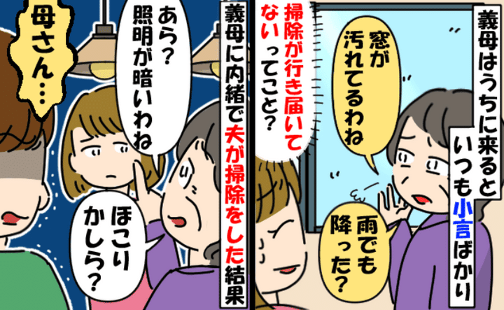 そこで意を決して「いつもお義母さんから注意されるから、掃除を手伝ってくれないかな?」と夫に持ちかけると、「全然いいよ~」と言ってくれたので、その日以降掃除は夫の担当に。そして、後日義母がわが家にまたやってきました。早速「あら? 照明がいつもより暗いわ。ほこりかしら?」と義母が言い出します。すると夫が「俺が朝掃除したばっかりだよ! 暗く見えるのはお母さんの目が悪いからじゃない?」と反撃。義母は返す言葉がなかったようで、これ以降小言がグッと減ったのでした。