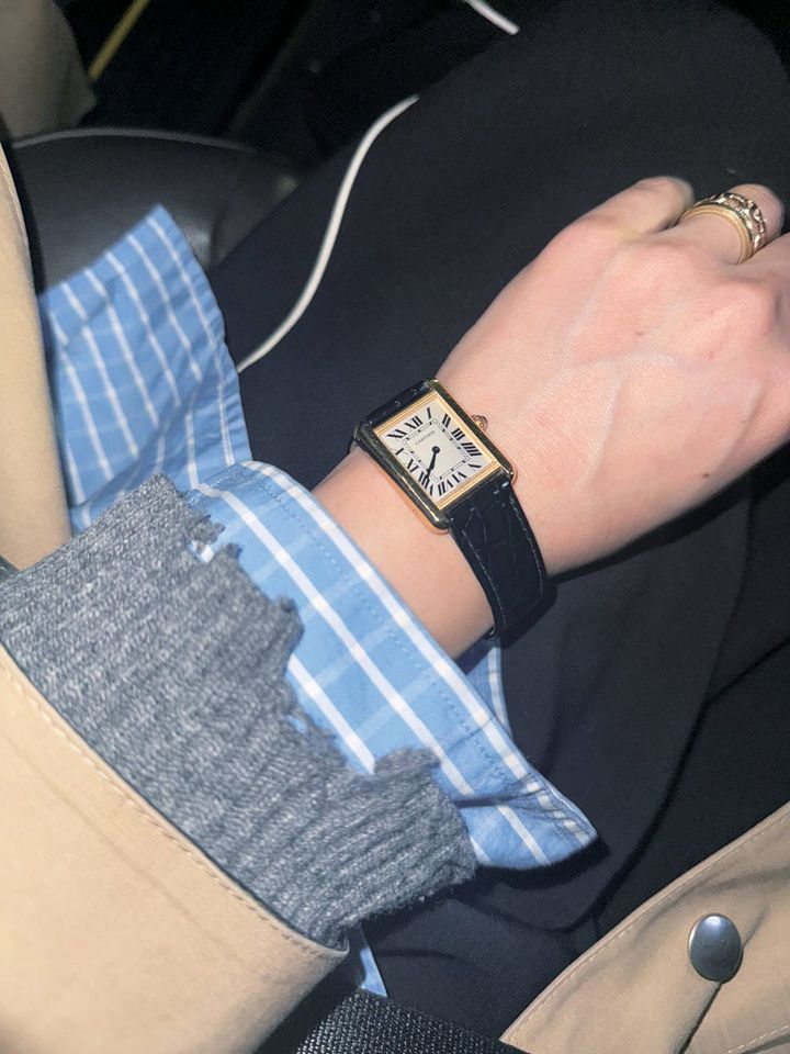 「スタイリストとして独立してすぐ、撮影で訪れたハワイで購入した“タンク ルイ カルティエ”。当時の私には見合わない高価なものでしたが、 たまたまお店に入ったとき急にビビっときて決めました。カジュアルなコーディネートに合わせても知的で上品な雰囲気を演出できるモダンさが好き。