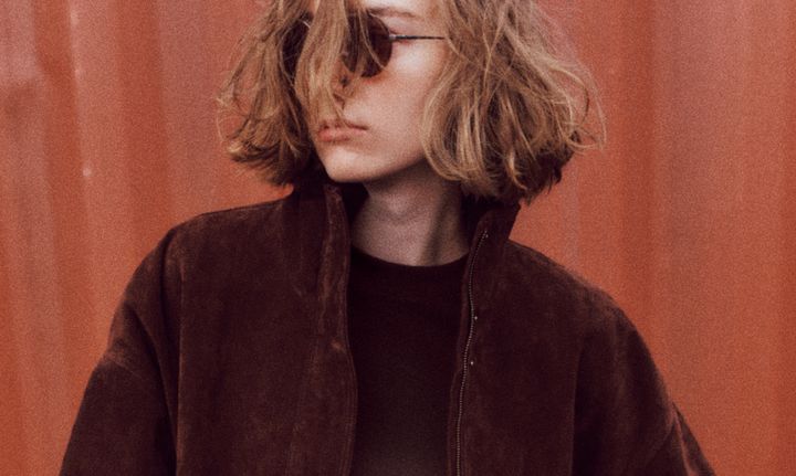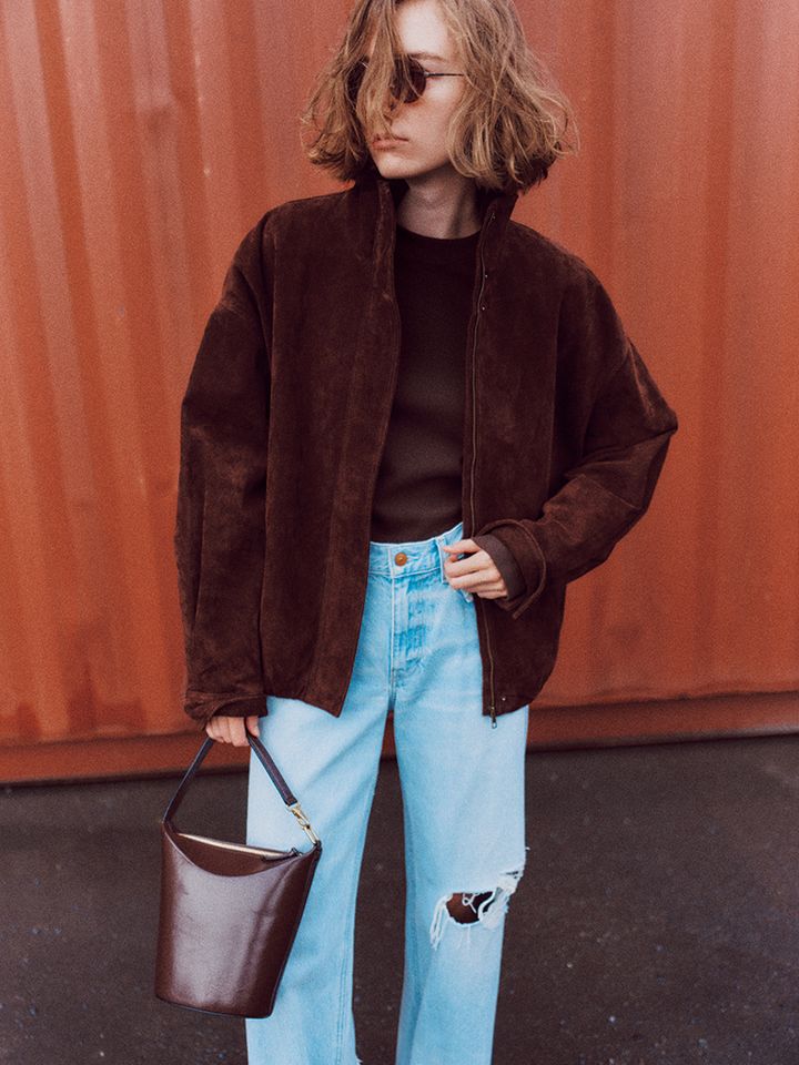 ブラウンスエードブルゾンジャケット /ザラ(ザラ カスタマーサービス) 高めのネックや適度なハリで洗練度高く。濃いブラウンも手伝って、ダメージデニムとでもおのずと上品。