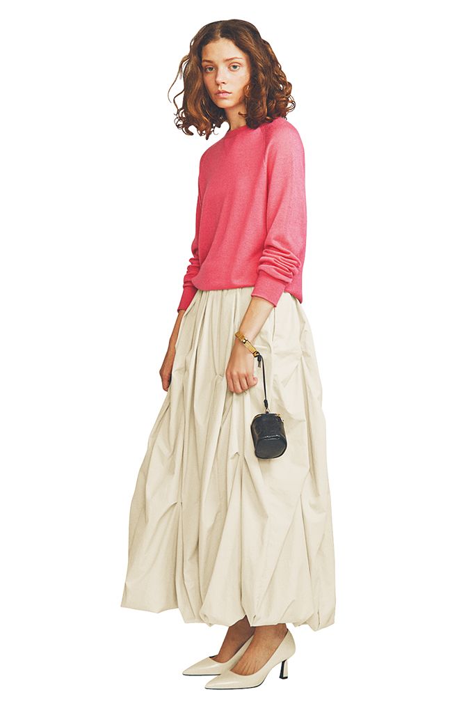 どことなくボーイッシュなピンクをさせば白のフレアスカートもこびない甘さに。ピンクで視線を引き上げ、下重心なスカートをスタイルよく。強いものどうしをぶつけてバランスを中和。