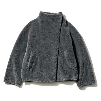 どうしてもほっこりしがちなボア素材を、都会的なグレーとアシンメトリーなフロントデザインでクールに昇華。タートルネックのように高く設定されたスタンドカラーが首元を温かく包み込み、モードな印象も加速させる。着脱がスムーズなスナップボタン仕様。