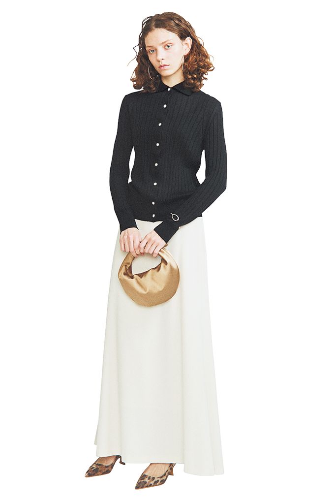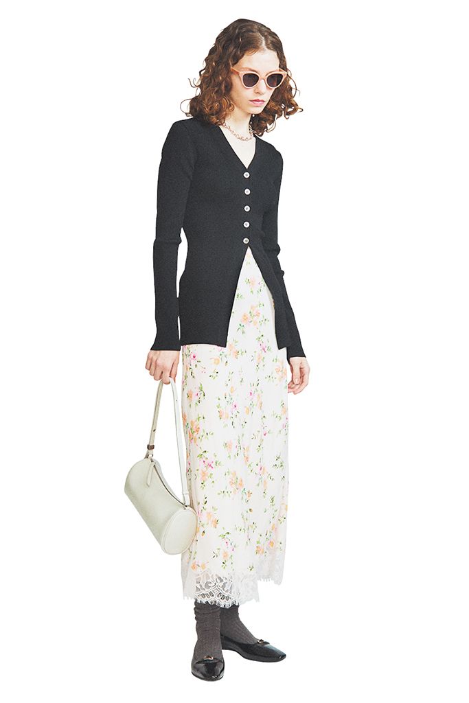 フロントボタンを腰あたりまでにとどめて逆Vを描くことで、長め丈にありがちな間のびを解消。安心感がありながらどんなボトムとでも脚を長く見せる高いウエスト位置をキープ。コケットな雰囲気がモダンに昇華。