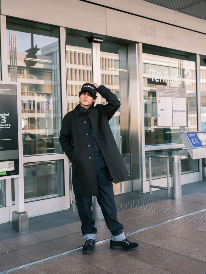 カリナと同じく、「プラダ」のショーに参加するため出国。ブラック×ブラウンでまとめたヘリテージムード漂う装いがクール。コーデュロイのマリンキャップで遊び心を加えて。