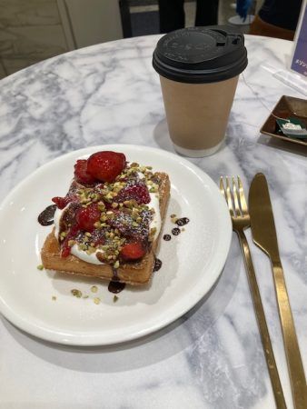 ワッフルは少し硬いイメージがあったのですが、サクサクで軽い!クリームも甘すぎず、甘酸っぱいイチゴとの相性がバツグン!ピスタチオの食感がアクセントになり、食後でもペロリ。おいしかったです。ワッフルというより、軽いケーキのようです