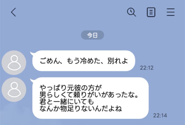 「やっぱり元彼の方が、男らしくて頼りがいがあったな。君と一緒にいても、なんか物足りないんだよね」