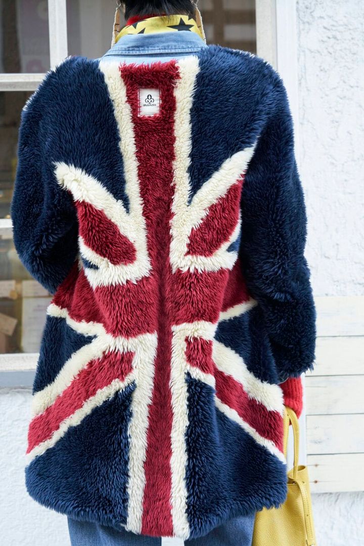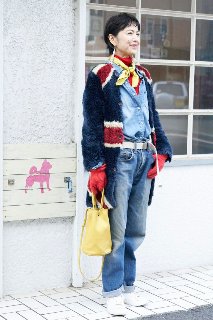 ユニオンジャックをモチーフにしたフェイクファーコートは、永遠のロック少女のユニフォームのよう。「これはモッズコートのインナーなんです」と藍田さん。インナーにしておくには惜しいと、アウターに昇格させて、ネイビー×イエロー×レッドの三色を配したブリティッシュテイストのコーデにしました。「デニムシャツはエーケーワンの初期のもので、デニムは定番のリーバイス501。スタンダードなカジュアルアイテムを組み合わせました」(藍田さん)
