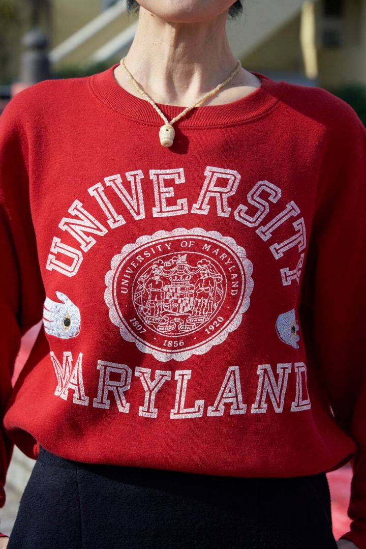 メリーランド州立大学のトレーナーは、古着ショップで見つけたメイドインUSA。赤字に白のロゴが、着こなしのアクセントに。