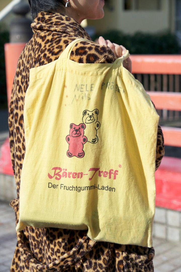 「近所を歩くときは布のエコバッグが多いですね」と藍田さん。レオパ柄の中の色と合わせてイエローのエコバッグを選びました。