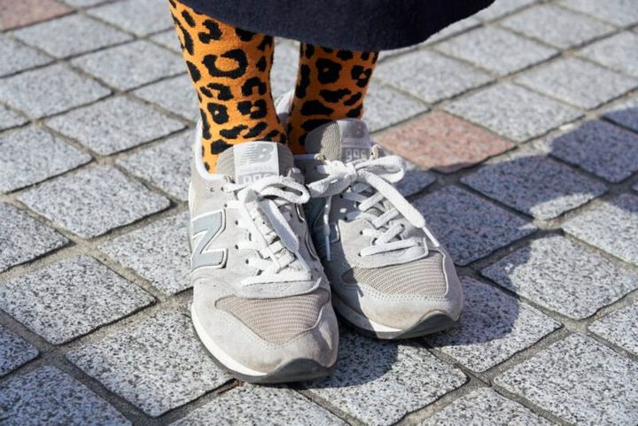 「外反母趾なのでスニーカーが中心。なかでもメイドインUSAのニューバランス996は、はきやすくてデザインも好み。これで三代目になりますね」と藍田さん。アウターに合わせたレオパ柄のソックスは、地元のテキーラバーで見つけました。