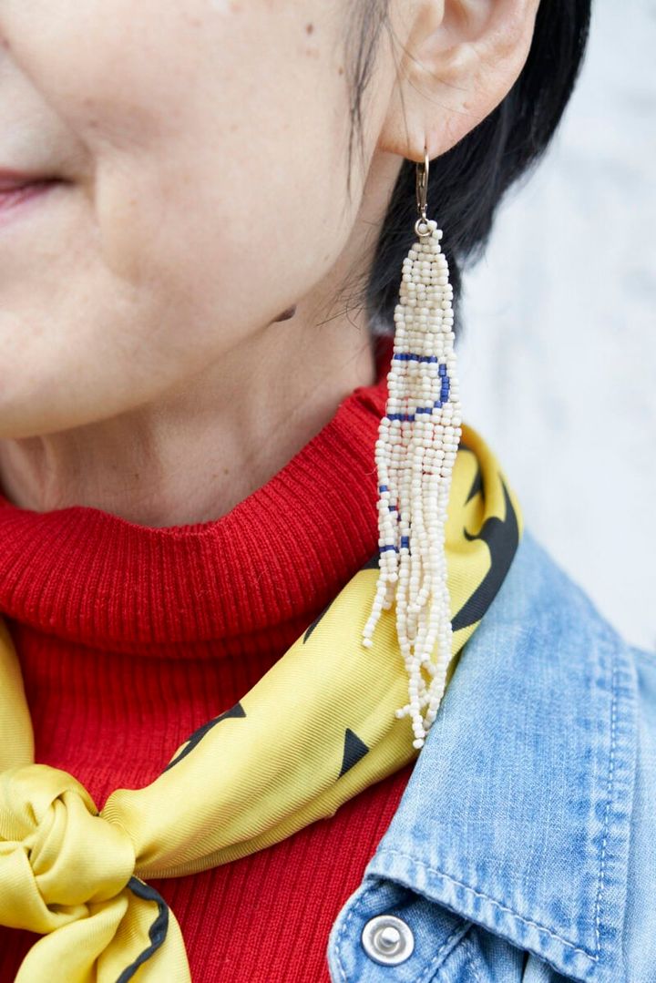オフホワイトのビーズに、ネイビーで絵を描くように組み合わせたビーズピアス。全体の色合わせが巧みで、耳元で揺れるデザインが映えます。