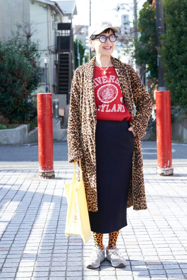近所をぶらっと散歩したり、食料品を買い物に行くときのスタイル。「レオパ柄のガウンとソックスに、真っ赤な古着のトレーナーを合わせるとインパクト大。こういう際どい着こなしは『間違ってませんよ』という顔で堂々と着て歩きます」と笑う藍田さん。ボトムスにはきれいめのタイトスカートをはいて、バランスをとります。「このスカートは親友の亜希のブランドのもの。グレーのパーカと合わせたり、白シャツに合わせてコンサバっぽくも着られますが、私はカジュアルに寄せました」(藍田さん)