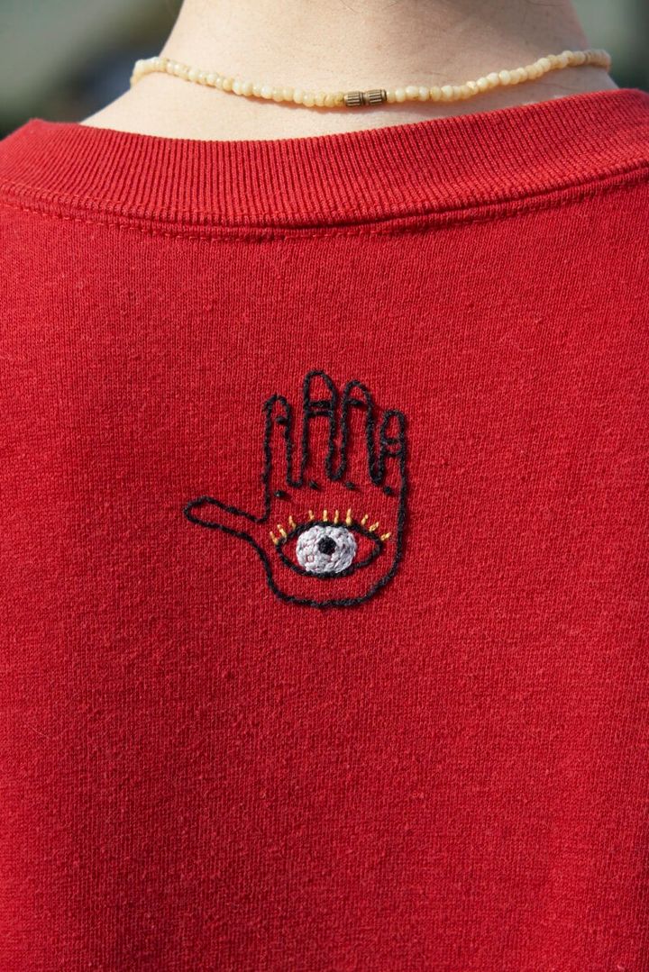「手を動かすのが好きで、ヒマを見つけては古着に刺しゅうをしています」と藍田さん。手と目のモチーフは、藍田さんのお気に入り。
