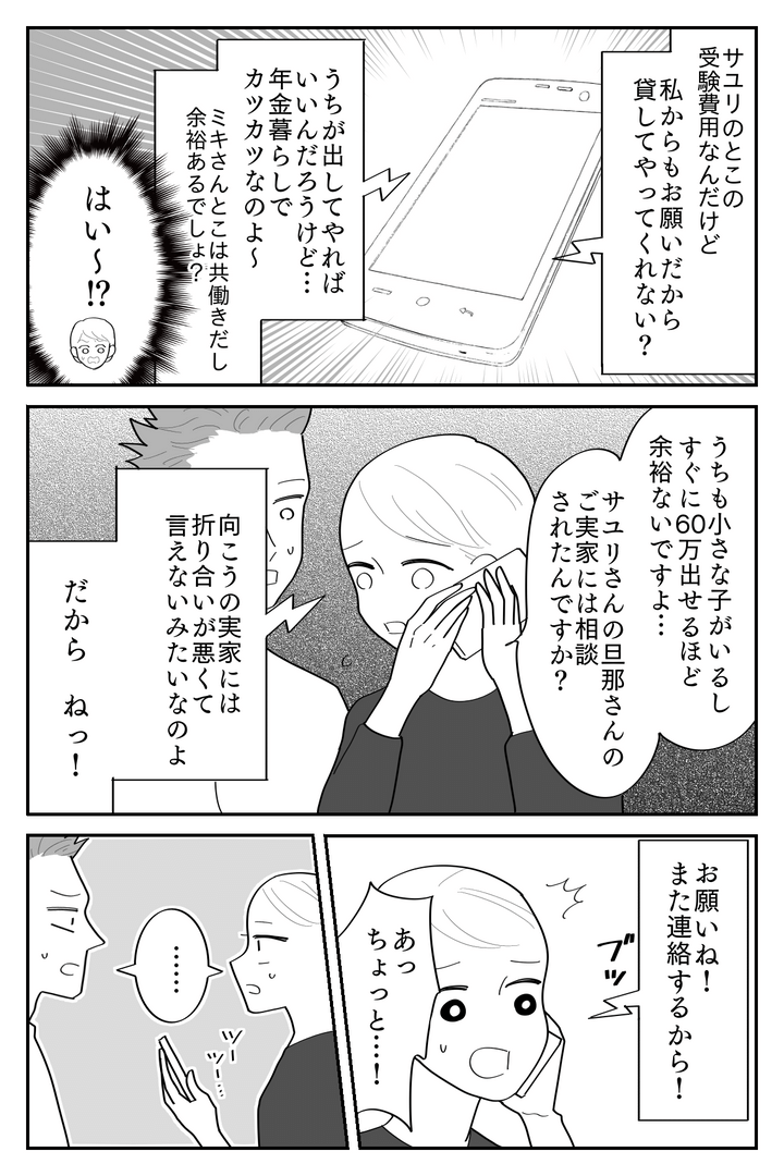 話を聞くと、学資保険はかけていたものの、受験に掛かる費用を見込んでいなかったとのこと。さらに義母までが「共働きで余裕があるでしょう」と貸す前提で話を進めてきます。ミキさん夫婦は「一度貸せば、お金の無心は続く」と判断し断る決断をしましたが、その後も義姉と義母からの催促は止まらず、ミキさんはだんだん疲弊していきます。