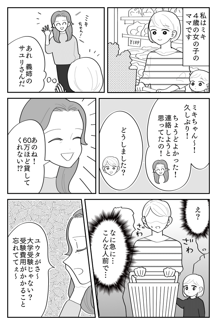 パートで働きながら幼い娘を育てるミキ(仮名)さんは、ある日スーパーで義姉サユリ(仮名)さんから突然「受験費用が足りないから60万円貸してほしい」と頼まれます。事前の相談もなく、軽い調子で持ちかけられたことに強い戸惑いを覚えるミキさん。