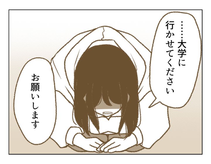 奨学金を利用してでも進学したいというアカリさんの思いも否定され、父のヒデキさんは最終的に「学費を出す代わりに土下座しろ」と迫ります。ミサトさんは夫を咎めようとはせず、「どうする? 土下座するの?」と他人事。土下座を強いられたアカリさんの心には、ある強い思いが沸き上がったのでした。