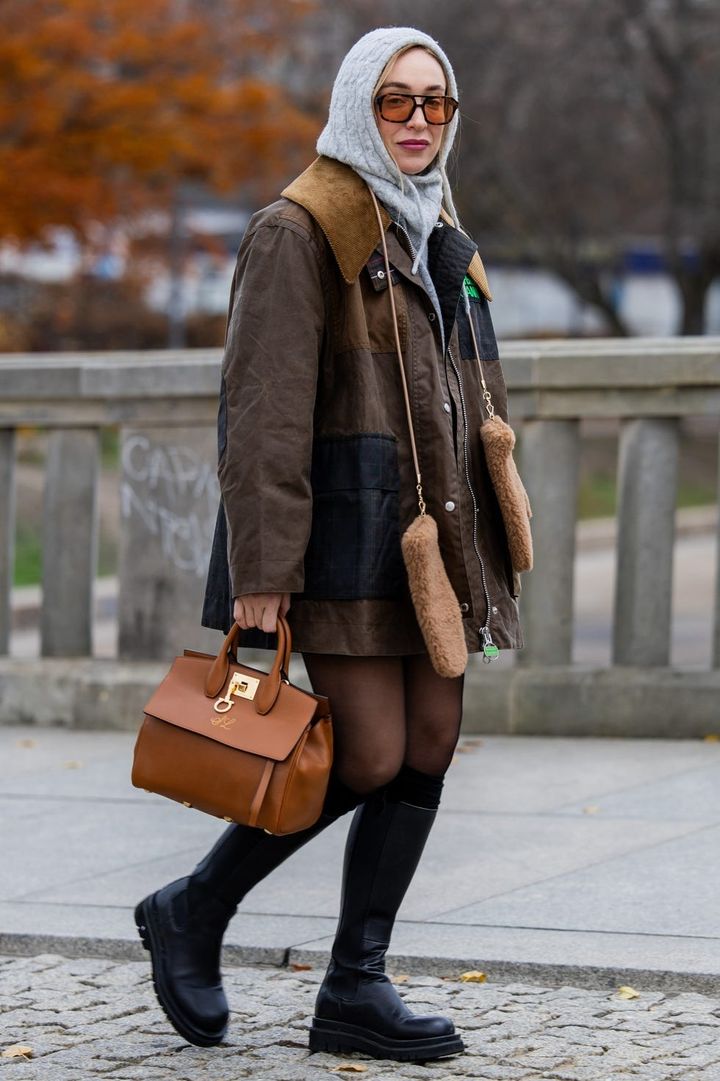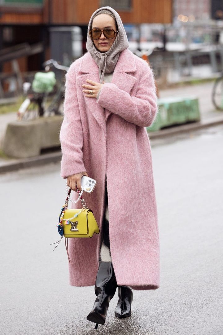 冬の装いが退屈である必要はないことを、このスタイルが証明している。バッグやシューズなどの小物でポップな色とリッチな質感を加えつつ、ニュートラルカラーのバラクラバを選んでルック全体を落ち着かせるのがポイント。