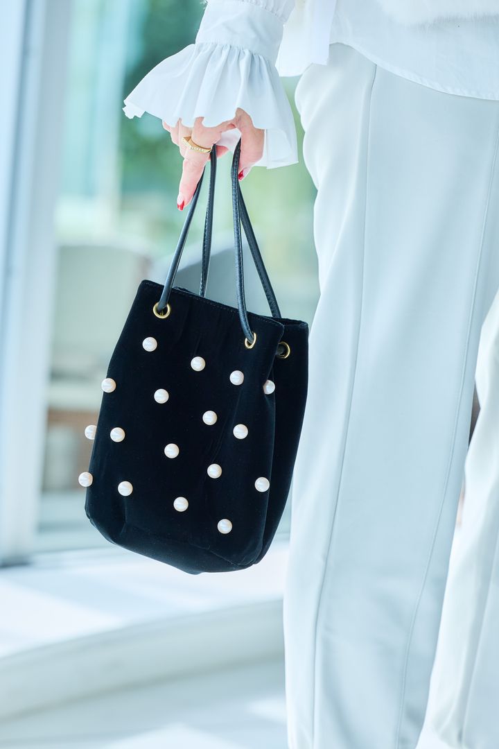 ベロア×パールの巾着バッグは持つだけで華やかに