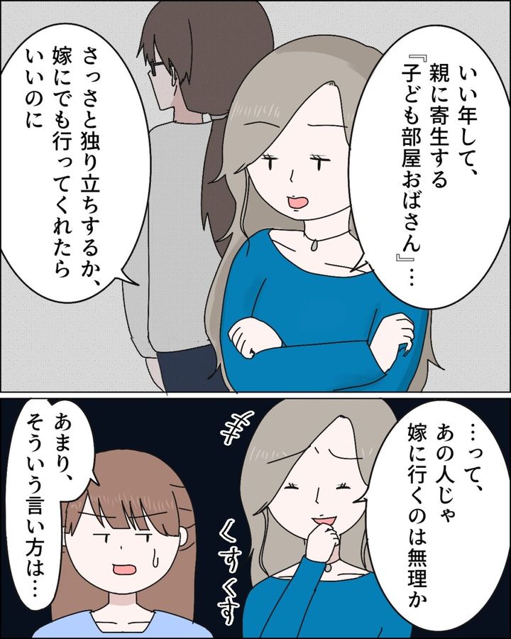 「いい年して親に寄生する『子ども部屋おばさん』、さっさと独り立ちするか、嫁にでも行ってくれたらいいのに・・・ってあの人じゃ嫁に行くのは無理か」馬鹿にするようにくすくすと笑う麻里さん。日頃から知佳さんにお世話になっている私は、「あまりそういう言い方は・・・」と悪口を控えるよう、やんわりと制しました。