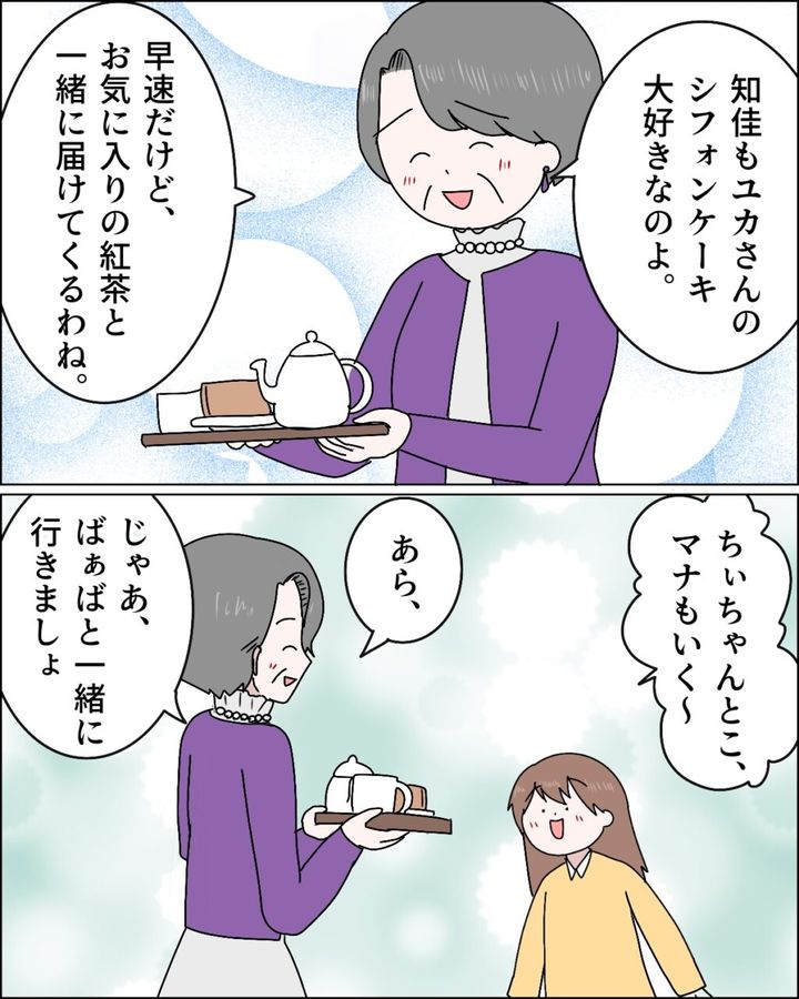 「知佳もユカさんのシフォンケーキ大好きなのよ、早速だけど、お気に入りの紅茶と一緒に届けてくるわね」義母はそう言うと、シフォンケーキと紅茶をお盆にのせて立ち上がりました。知佳さんが大好きなマナは、「ちぃちゃんとこマナもいく~」と嬉しそうに義母の後をついていきます。