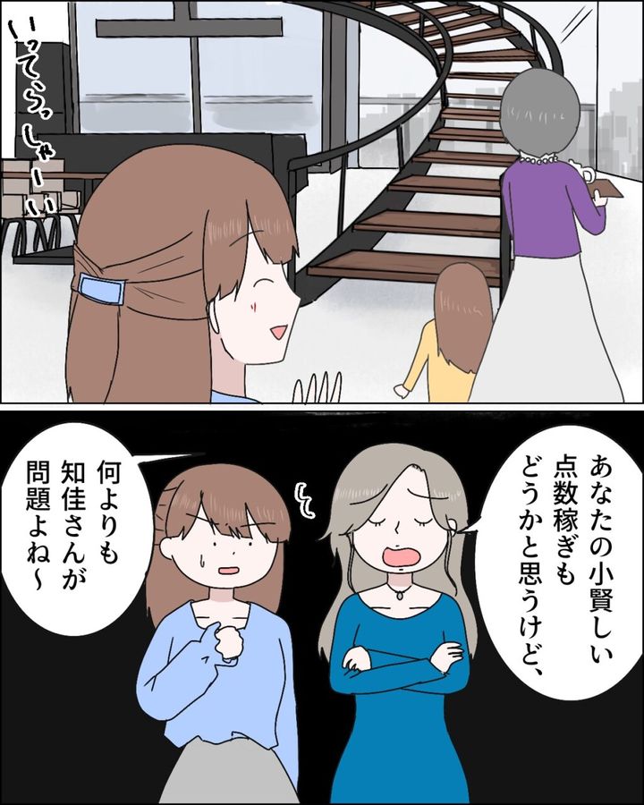 私は「いってらっしゃーい」と声をかけながら、豪華な階段を上っていく義母とマナを見送りました。するとすかさず麻里さんが、「あなたの小賢しい点数稼ぎもどうかと思うけど、何よりも知佳さんが問題よね~」と呆れたように言います。・・・また始まった。義母の姿が見えなくなると、麻里さんは決まって態度を豹変させるのです。