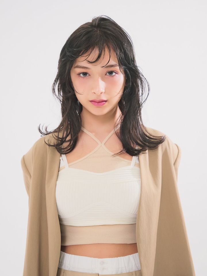 目や顔のパーツを引き立たせるために、あえて髪型もカラーもシンプルに。オリ-ブベースに青みを加えたカラーをワンメイクで入れている。屋内では深いブル-みのある色、太陽光の下だとオリ-ブみを感じさせるカラーと、シーンによって髪色も印象も変わるのが楽しい。