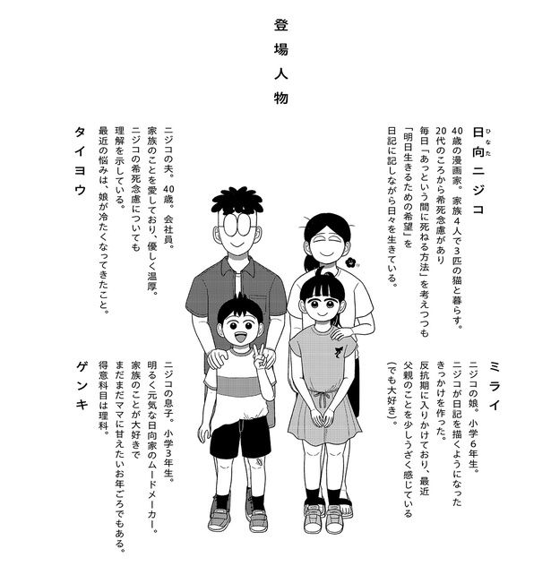 母の心ない言葉や初恋の人の自死をきっかけに、心のバランスを崩し希死念慮を抱えるようになった漫画家・日向ニジコ(40歳)。2児の母となったニジコは、明日も生きようとするために、その日見た美しいものを日記に描いている。『死にたがりやさんの明日生きるため日記』は、「死にたい気持ち」を受け入れて、明日を生きる日々を綴ったコミックエッセイです。